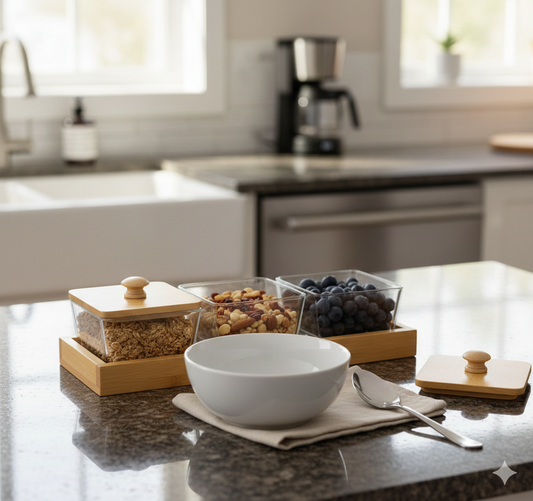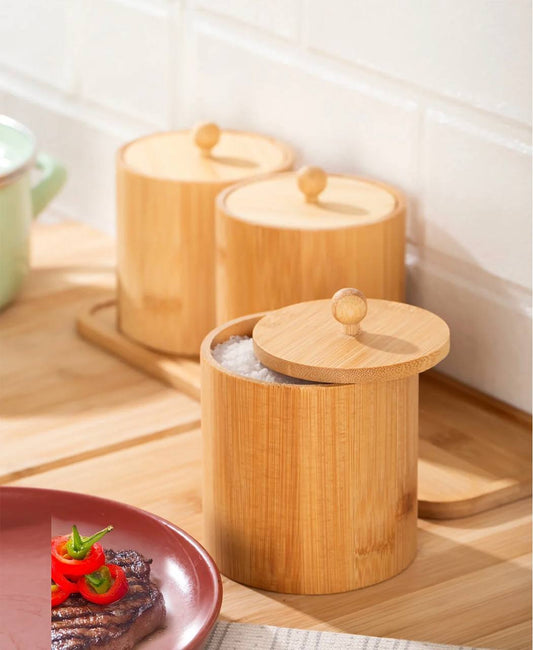 طقم أنيق من 3 برطمانات زجاجية مع أغطية من الخيزران وصينية خشبية – مثالي للمطبخ